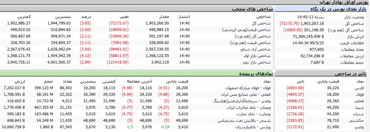 بر اساس آمارهای معاملاتی، روز جاری شاخص های بورس با نوسان مواجه شدند به طوری که شاخص کل با (۷۲۱۶۸) واحد ریزش معادل (۳.۶۵) درصد به یک میلیون و ۹۰۳ هزار ۲۷۱ واحد، شاخص قیمت «وزنی - ارزشی» با (۱۸۹۵۸) واحد افت معادل (۳.۶۵) درصد به ۴۹۹ هزار ۹۸۵ واحد، شاخص کل «هم وزن» با (۱۰۸۰۰) واحد ریزش معادل (۲.۱۱) درصد به ۵۰۱ هزار و ۲۰۴ واحد، شاخص قیمت «هم وزن» با (۷۰۸۷) واحد کاهش معادل (۲.۱۱) درصد به ۳۲۸ هزار و ۹۱۰ واحد، شاخص آزاد شناور با (۹۸۴۵۵) واحد افت معادل (۳.۶۹) درصد به ۲ میلیون و ۵۶۷ هزار و ۳۳۷ واحد، شاخص بازار اول با (۵۸۸۱۱) واحد کاهش معادل (۴.۱۲) درصد به یک میلیون و ۳۶۸ هزار ۱۲۲ واحد و شاخص بازار دوم با (۱۲۱۳۹۴) واحد افت معادل (۲.۹۹) درصد به ۳ میلیون و ۹۴۲ هزار و ۱۴۴ واحد رسید.