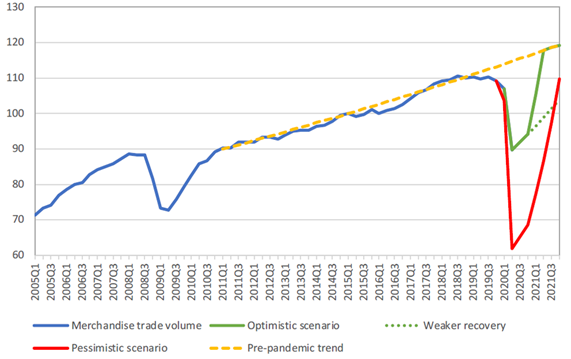 با توجه به سرعت آهسته بازیابی اقتصادی، ممکن است رشد تجارت جهانی همچنان در سطح پایینتر از مسیر قبل از شیوع بیماری باقی بماند. در نمودار ۱ خطوط نقطه چین سبز رنگ نشان‌هنده این موضوع است که در این حالت رشد تجارت برای سال ۲۰۲۱ نزدیک به ۵ درصد خواهد بود. از سوی دیگر، بازگشت سریع به مسیر پیش از بیماری همه گیر، رشد تجارت در سال ۲۰۲۱ را در حدود ۲۰ درصد، مطابق با سناریوی خوش‌بینانه پیش بینی آوریل، نشان می‌دهد. انتخاب سیاست‌های پولی، مالی و تجاری نقش مهمی در تعیین سرعت بهبودی خواهد داشت.