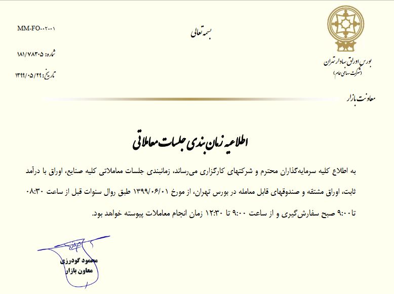 بر این اساس زمان بندی جلسات معاملاتی کلیه صنایع، اوراق با درآمد ثابت، اوراق مشتقه و صندوق های قابل معامله در بورس تهران، از یک شهریور ماه ۹۹ طبق روال پیشین از ساعت ۰۸:۳۰ تا۹:۰۰ صبح سفارش گیری و از ساعت ۹:۰۰ تا ۱۲:۳۰ زمان انجام معاملات پیوسته خواهد بود.