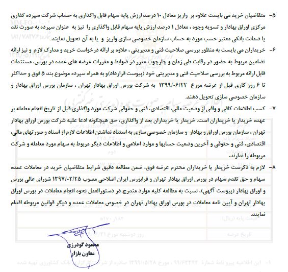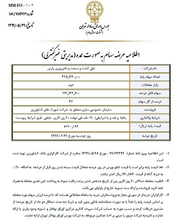 اطلاعیه عرضه بلوک ۳۶ درصدی ملی کشت و صنعت و دامپروری پارس