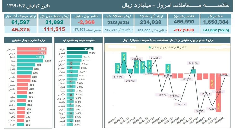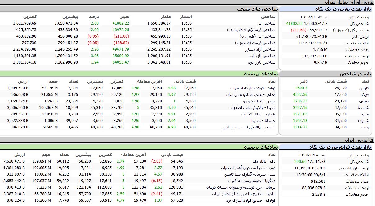 بر اساس آمارهای معاملاتی، روز جاری همه شاخص‌های بورس با رشد دسته جمعی مواجه شدند به طوری که شاخص کل با ۴۱۷۷۸ واحد صعود معادل ۲.۶۰ درصد به یک میلیون و ۶۵۰ هزار و ۳۵۹ واحد، شاخص‌ قیمت «وزنی - ارزشی» با ۱۰۹۶۸ واحد افزایش معادل ۲.۶۰ درصد به ۴۳۳ هزار و ۳۰۵ واحد، شاخص کل «هم وزن» با (۲۱۵) واحد افت معادل (۰.۵) درصد به ۴۵۵ هزار و ۹۸۶ واحد، شاخص قیمت «هم وزن» با (۱۴۱) واحد کاهش معادل (۰.۵) درصد به ۲۹۹ هزار و ۱۴۲ واحد، شاخص آزاد شناور با ۴۹۶۵۶ واحد افزایش معادل ۲.۲۶ درصد به ۲ میلیون و ۲۴۵ هزار و ۱۹۱ واحد، شاخص بازار اول با ۳۵۶۰۹ واحد افزایش معادل ۳.۰۶ درصد به یک میلیون و ۲۰۰ هزار ۱۳۲ واحد و شاخص بازار دوم با ۶۳۹۳۱ واحد صعود معادل ۱.۹۴ درصد به ۳ میلیون و ۳۶۲ هزار و ۲۴۲ واحد رسید.