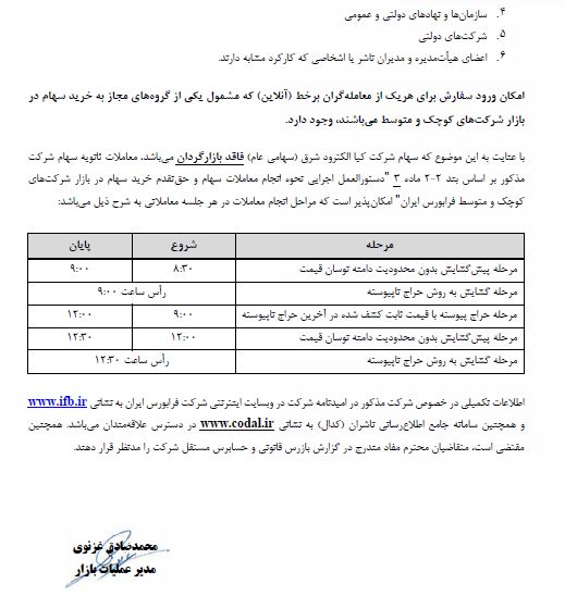 با توجه به اینکه سهام شرکت کیا الکترود شرق فاقد بازارگردان است معاملات ثانویه و حق تقدم خرید سهام در بازار شرکت های کوچک و متوسط فرابورس امکانپذیر است که مراحل انجام معاملات در هر جلسه معاملاتی به شرح اطلاعیه ذیل است: