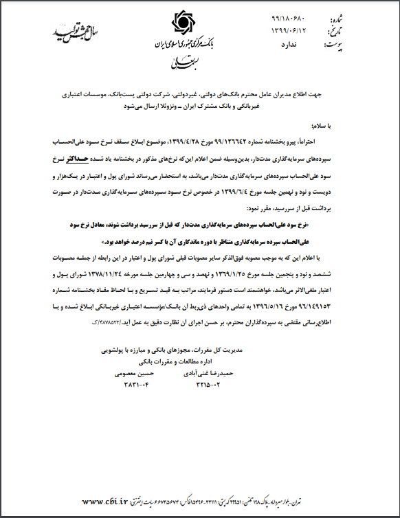 به گزارش خبرنگار ایبِنا، بانک مرکزی با صدور بخشنامهای به تمامی بانکها و موسسات اعتباری پیرو بخشنامه قبلی با موضوع ابلاغ سقف نرخ سود علیالحساب سپردههای سرمایهگذاری مدتدار با تاکید بر اینکه نرخهای مذکور در بخشنامه یاد شده حداکثر نرخ سود علیالحساب سپردههای سرمایهگذاری مدتدار است اعلام کرد که شورای پول و اعتبار در یکهزار و دویست و نود و نهمین جلسه خود در خصوص نرخ سود سپردههای سرمایهگذاری مدتدار در صورت برداشت قبل از سررسید مقرر نمود که نرخ سود علیالحساب سپردههای سرمایهگذاری مدتدار که قبل از سررسید برداشته شوند معادل نرخ سود علیالحساب سپرده سرمایهگذاری متناظر با دوره ماندگاری آن با کسر نیم درصد خواهد بود.