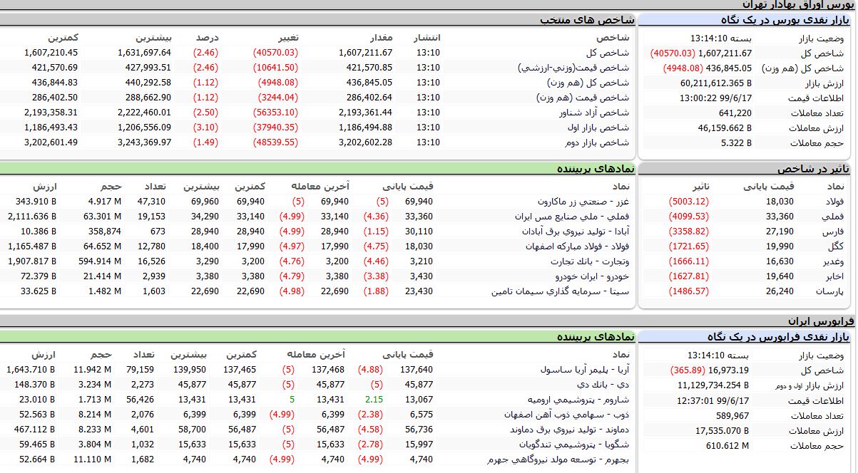 بر اساس آمارهای معاملاتی، روز جاری شاخص های بورس با نوسان مواجه شدند به طوری که شاخص کل با (۴۰۵۷۰) واحد ریزش معادل (۲.۴۶) درصد به یک میلیون و ۶۰۷ هزار ۲۱۱  واحد، شاخص قیمت «وزنی - ارزشی»  با (۱۰۶۴۱) واحد افت معادل (۲.۴۶) درصد به ۴۲۱ هزار ۵۷۰ واحد، شاخص کل «هم وزن» با (۴۹۴۸) واحد ریزش معادل (۱.۱۲) درصد به ۴۳۶ هزار و ۸۴۵ واحد، شاخص قیمت «هم وزن» با (۳۲۴۴) واحد کاهش معادل (۱.۱۲) درصد به ۲۸۶ هزار و ۴۰۲ واحد، شاخص آزاد شناور با (۵۶۳۵۳) واحد افت معادل (۲.۵۰) درصد به ۲ میلیون و ۱۹۳ هزار و ۳۶۱ واحد، شاخص بازار اول با (۳۷۹۴۰) واحد کاهش معادل (۳.۱۰) درصد به یک میلیون و ۱۸۶ هزار ۴۹۴ واحد و شاخص بازار دوم با (۴۸۵۳۹) واحد افت معادل (۱.۴۹) درصد به ۳ میلیون و ۲۰۲ هزار و ۶۰۲ واحد رسید.
