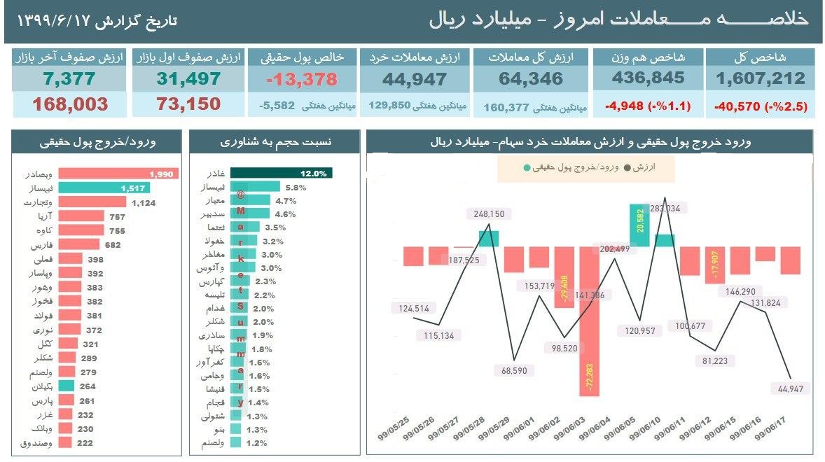 در عین حال نگاهی به آمارهای معاملاتی امروز بازار سهام مشخص می کند:  قیمت سهام نمادهای «پتایر با ۴.۹۹ درصد، قنیشا با ۴.۹۹ درصد، ثبهساز با ۴.۷۲ درصد، کدما با ۳.۵۶ درصد، نمرینو با ۱.۶۳ درصد، وسخراج با ۱.۱۳ درصد و ولپارس با ۰.۵۴ درصد»  بیشترین افزایش قیمت و نمادهای «آپ با (۵) درصد، تاصیکو با (۵) درصد، غزر با (۵) درصد، پارسان با (۵) درصد، کترام با (۵) درصد، وبانک با (۵) درصد و وسینا با (۴.۹۹) درصد» بیشترین کاهش قیمت را در بازار سهام رقم زدند.