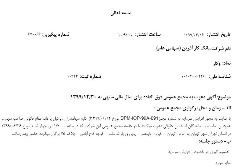 لازم به ذکر است تصمیم گیری در خصوص افزایش سرمایه دستور جلسه مجمع عمومی فوق العاده شرکت بانک‌ کارآفرین اعلام شده است.