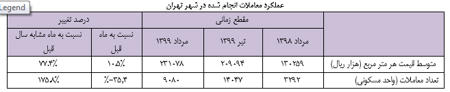 در مرداد ماه سال ۱۳۹۹، تعداد معاملات آپارتمانهای مسکونی شهر تهران به ۹۰۸۰ واحد مسکونی رسید که نسبت به مرداد ماه ۹۸ افزایش حدود ۱۷۶ درصدی را تجربه کرد. در این راستا قیمت هر مترمربع واحد مسکونی در مرداد ۹۹ حدود ۲۳۱.۱ میلیون ریال بود که نسبت به تیرماه گذشته ۱۰.۵ درصد و نسبت به مرداد ماه سال گذشته حدود ۷۷.۴ درصد افزایش یافت. بیشترین سهم قرارداهای منعقده مربوط به مناطق ۵، ۴ و ۱۰ است که در مجموع بیش از ۳۲ درصد از حجم معاملات مرداد ماه را به خود اختصاص دادهاند.