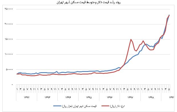 روند رشد قیمت دلار و متوسط قیمت مسکن شهر تهران
