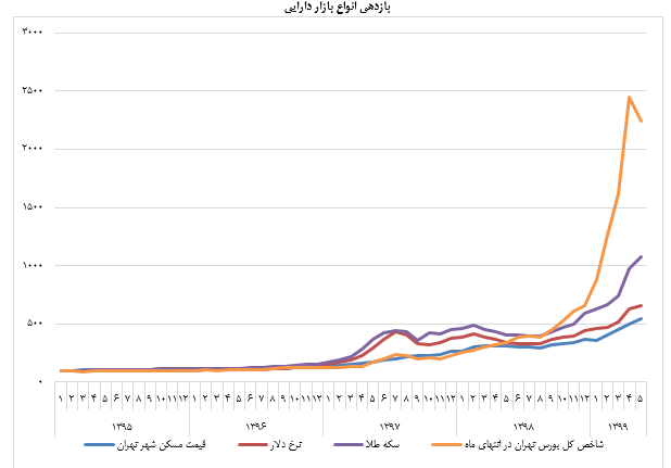 شاخصه اصلی اقتصاد ایران در سال ۹۹ انتظارات تورمی است که موجب تحرکات انواع بازارهای دارایی از ابتدای سال شده است. در نمودار زیر شاخص قیمت بازارهای مختلف که در فروردین ماه ۱۳۹۵ به عدد ۱۰۰ نرمال شدهاند را نشان میدهد. از بین این بازارها تا ماه گذشته بازدهی بازار سرمایه سرآمد سایر بازارها بود.