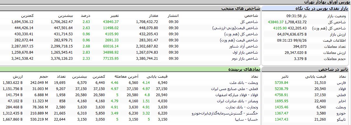به گزارش خبرنگار ایبِنا، در معاملات روز جاری تالار شیشه ای «تا لحظه تنظیم خبر» شاخص بورس با ۴۳ هزار و ۸۴۰ واحد افزایش، در کانال یک میلیون و ۷۰۰ هزار واحدی قرار گرفت و به یک میلیون و ۷۰۸ هزار و ۴۳۲ واحد رسید.