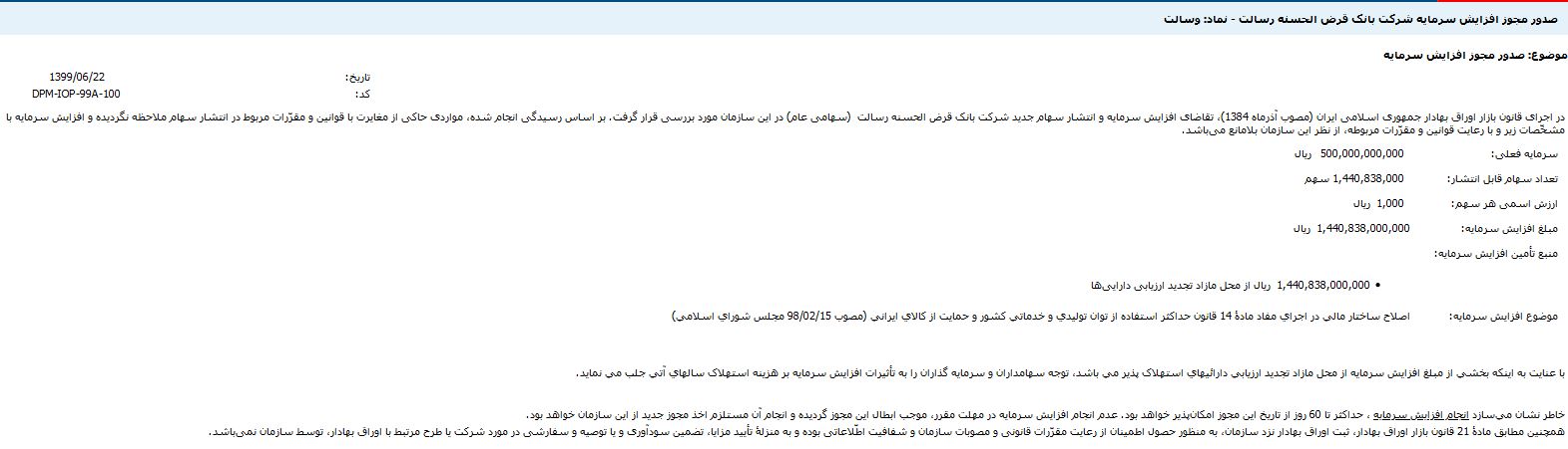 با صدور مجوز از سوی سازمان بورس و اوراق بهادار، بانک قرض‌الحسنه رسالت در نظر دارد تا از محل تجدید ارزیابی دارایی‌ها و برای اصلاح ساختار مالی افزیش سرمایه ۲۸۸ درصدی را نهایی کند.