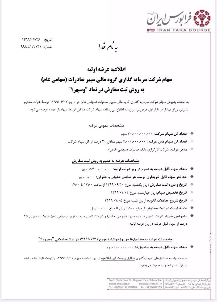 اطلاعیه عرضه اولیه ۲۰ درصدی گروه مالی سپهر صادرات