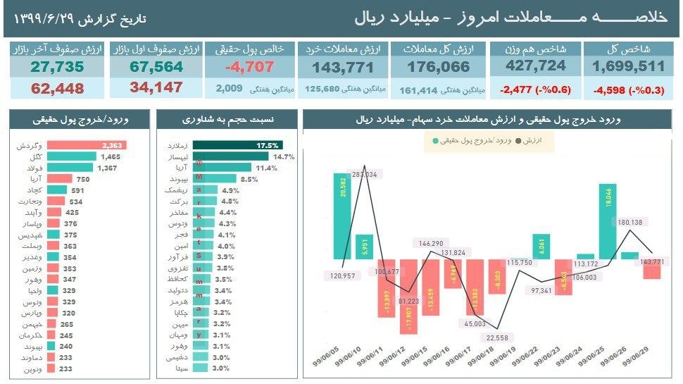 از سویی دیگرجزییات داد و ستدهای روز جاری مشخص می کند که امروز ۷ نماد « کگل با ۱۹۹۲ واحد، فولاد با ۱۶۶۲ واحد، فارس با ۱۳۳۱ واحد، فملی با (۱۳۱۷) واحد، حکشتی با (۱۱۴۳) واحد، رمپنا با (۱۰۵۹) واحد، و همراه با (۱۰۱۳) واحد»، بیشترین تاثیر را در روند حرکتی شاخص کل بورس بر جای گذاشتند.