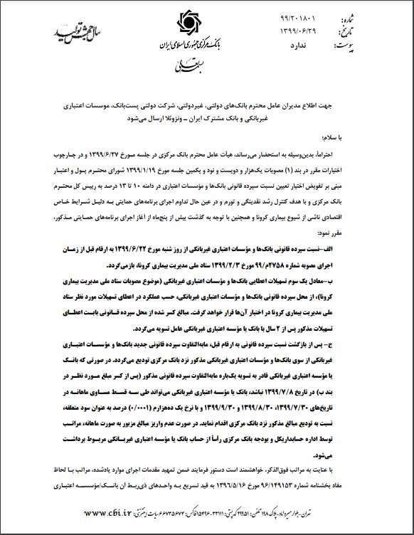 ۲. معادل یک سوم تسهیلات اعطایی بانکها و موسسات اعتباری غیربانکی (موضوع مصوبات ستاد ملی مدیریت بیماری کرونا)، از محل سپرده قانونی بانکها و مؤسسات اعتباری غیربانکی، حسب عملکرد در اعطای تسهیلات مورد نظر ستاد ملی مدیریت بیماری کرونا در اختیار آنها قرار خواهد گرفت. مبالغ کسر شده از محل سپرده قانونی بابت اعطای تسهیلات مذکور پس از ۲ سال با بانک یا مؤسسه اعتباری غیربانکی عامل تسویه میشود.