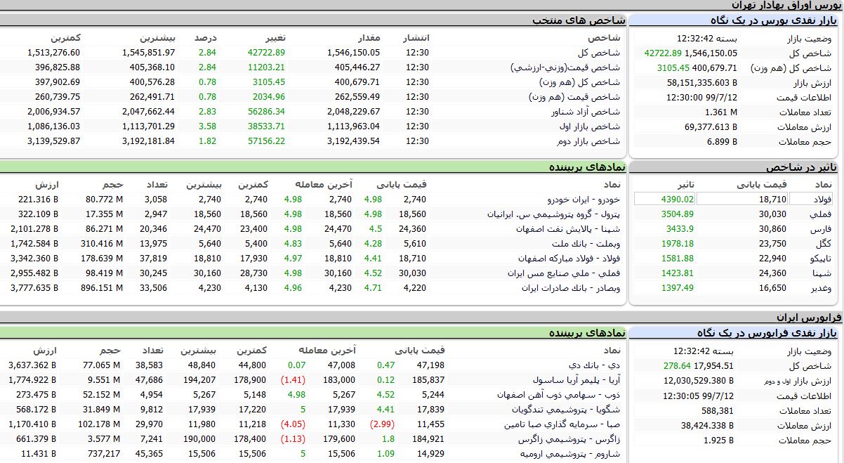 شاخص بورس در پایان داد و ستدهای روز جاری با رشد بیش از ۴۲۰۰۰ واحدی بعد از مدت ها رنگ تالار شیشه‌ای را از قرمز به سبز تبدیل کرد و باعث شد تا نماگر اصلی بازار به یک میلیون و ۵۴۶ هزار و ۱۴۹ واحد برسد.