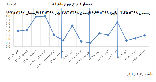 در این گزارش آمده است شاخص قیمت مصرف کننده در پایان زمستان ۱۳۹۸ دررمجموع نسبت به پایان پاییز ۱۳۹۸ حدود ۳.۵ درصد رشد داشته است. نرخ تورم ماهیانه پس از کاهش در دی ماه و رسیدن به رقم ۰.۸ درصد، در دو ماه بهمن و اسفند مجدد روند صعودی گرفته و به ترتیب به ۱.۱ و ۱.۴ درصد رسیده است.