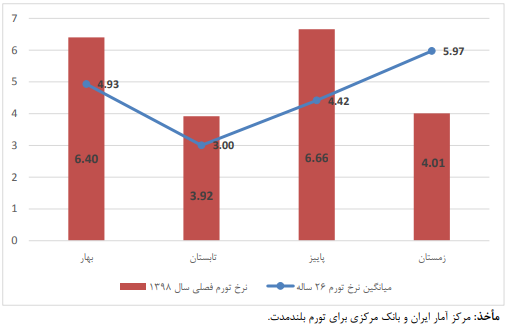 نرخ تورم در سال ۱۳۹۸، دارای نوسانات زیادی بوده و از روند همواری برخوردار نبوده است. به طوری که نرخ تورم ماهیانه در برخی از ماه ها بسیار بالاتر از میانگین بلندمدت و در برخی از ماه ها به میزان قابل توجهی پایینتر از میانگین بلندمدت قرار داشته است. اما در مجموع نرخ تورم نقطه به نقطه ۲۲ درصدی سال ۱۳۹۸ بالاتر از میانگین بلندمدت ۲۶ ساله (۱۹.۷۶) قرار داشته است. در این میان سه فصل اول سال ۱۳۹۸ باالتر از میانگین بلندمدت و فصل زمستان پایینتر از میانگین بلندمدت قرار دارد.