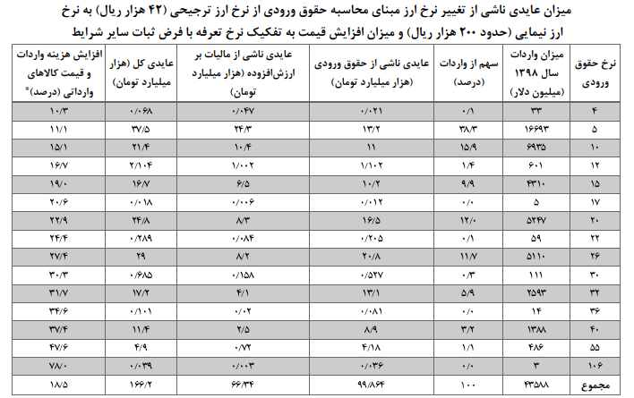 از طرفی، در نظر گرفتن نرخ ارز ۴۲ هزار ریال برای محاسبه حقوق ورودی به جای نرخ ارز نیمایی (حدود ۲۰۰ هزار ریال)، علاوه بر کاهش درآمد دولت، نرخ موثر حقوق ورودی را نیز کاهش داده و در نتیجه نرخ حمایت موثر از کالای داخلی در مقابل کالای وارداتی عملا به حدود یک پنجم کاهش یافته است.