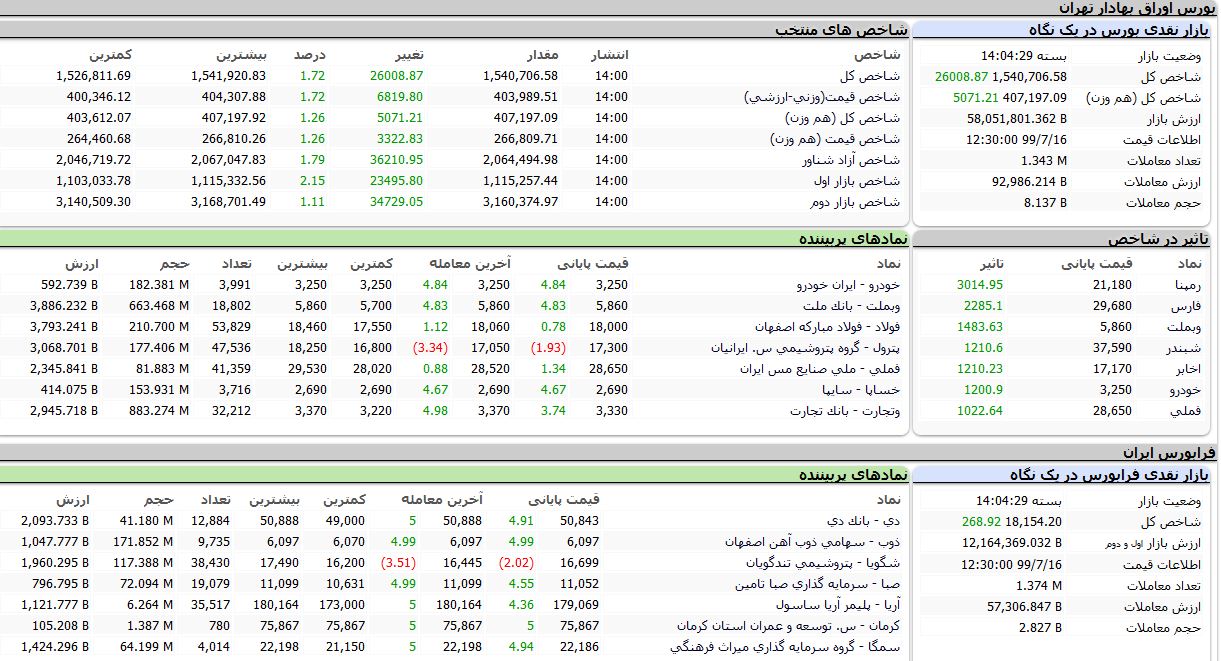بر اساس آمارهای معاملاتی، روز جاری همه شاخصهای بورس با رشد دسته جمعی مواجه شدند به طوری که شاخص کل با ۲۶۰۰۸ واحد صعود معادل ۱.۷۲ درصد به یک میلیون و ۵۴۰ هزار و ۷۰۶ واحد، شاخص قیمت «وزنی - ارزشی» با ۶۸۱۹ واحد افزایش معادل ۱.۷۲ درصد به ۴۰۳ هزار و ۹۸۹ واحد، شاخص کل «هم وزن» با ۵۰۷۱ واحد صعود معادل ۱.۲۶ درصد به ۴۰۷ هزار و ۱۹۷ واحد، شاخص قیمت «هم وزن» با ۳۳۲۲ واحد صعود معادل ۱.۲۶ درصد به ۲۶۶ هزار و ۸۰۹ واحد، شاخص آزاد شناور با ۳۶۲۱۰ واحد افزایش معادل ۱.۷۹ درصد به ۲ میلیون و ۶۴ هزار و ۴۹۴ واحد، شاخص بازار اول با ۲۳۴۹۵ واحد افزایش معادل ۲.۱۵ درصد به یک میلیون و ۱۱۵ هزار ۲۵۷ واحد و شاخص بازار دوم با ۳۴۷۲۹ واحد صعود معادل ۱.۱۱ درصد به ۳ میلیون و ۱۶۰ هزار و ۳۷۴ واحد رسید.