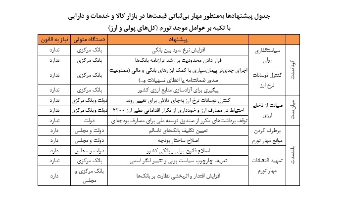 نرخ و نوسانات ارز به عنوان لنگر اسمی اقتصاد ایران و پس از آن حجم پول، بیشترین همگرایی را با نرخ تورم در کوتاه مدت دارند. بنابراین در افق کوتاه مدت، تثبیت اقتصاد نیازمند کاهش نوسانات نرخ ارز و کنترل رشد پول (نسبت پول به نقدینگی) است. با توجه به توضیحی که در چرایی افزایش نرخ ارز آمد، کنترل نرخ و نوسانات ارز اولاً، نیازمند بهبود شرایط تجارت خارجی کشور و بازگشت ارز حاصل از صادرات و ثانیاً، افزایش قدرت مداخله بانک مرکزی است. به منظور کنترل رشد پول نیز تعدیل مناسب نرخ سود بین بانکی به عنوان مهم ترین نرخ سود اقتصاد (با توجه به وضعیت ترازنامه شبکه بانکی) و به تبع آن سایر نرخهای سود بازار پول، پیشنهاد میشود.