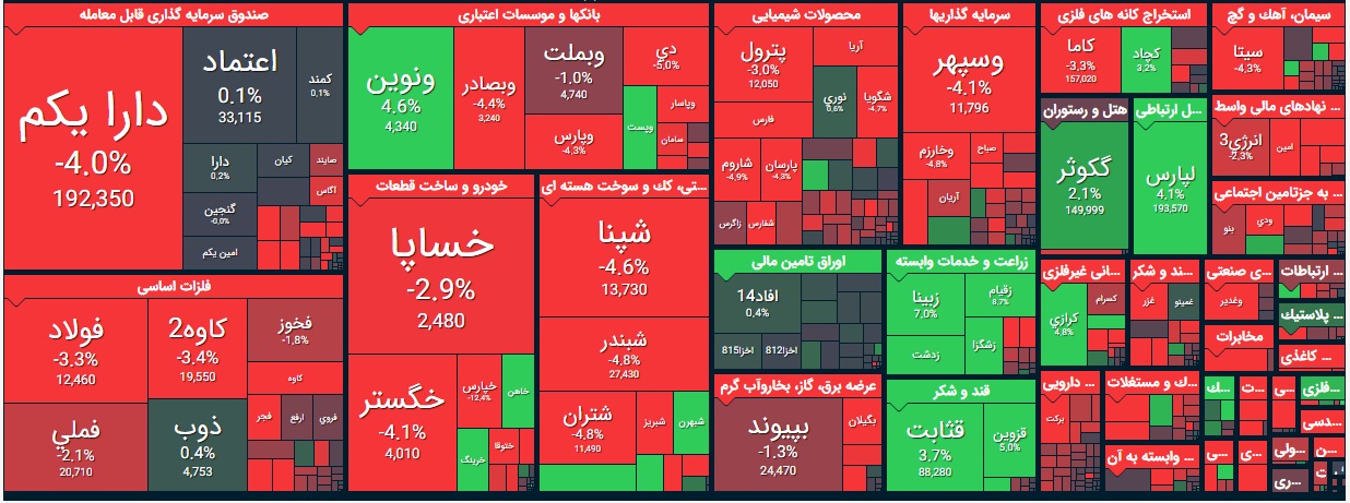 بر اساس این گزارش، در معاملات امروز بورس تهران، نماد معاملاتی فارس متعلق به صنایع پتروشیمی خلیج فارس با ۴۶۰۶ واحد کاهش، بیشترین تاثیر منفی را در روند نزولی شاخص کل بورس داشت و پس از آن نیز نمادهای معاملاتی فولاد، فملی، شپنا، شتران و شبندر، بیشترین اثرگذاری را در قرمزپوش شدن نماگر بورس داشتند. همچنین نمادهای معاملاتی کچاد، شبهرن، ونوین و شسپا، با بیشترین افزایش، از افت بیشتر شاخص کل بورس جلوگیری کردند.