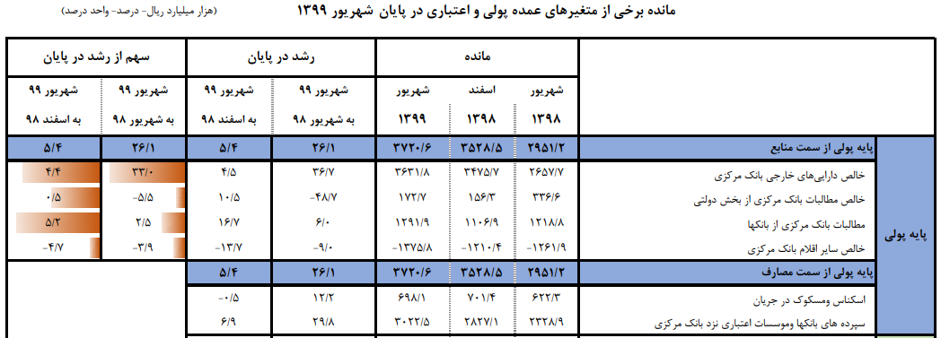 اسکناس و مسکوک در جریان در پایان ششمین ماه سال جاری به رقم ۶۹۸.۱ هزار میلیارد ریال رسیده که نسبت به شهریورماه سال گذشته، ۱۲.۲ درصد رشد دارد. همچنین سپرده های بانک ها و موسسات اعتباری نزد بانک مرکزی با رشد ۲۹.۸ درصدی در شهریورماه ۱۳۹۹ به رقم ۳۰۲۲.۵ هزار میلیارد ریال رسیده است.