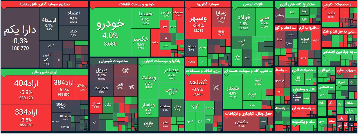 بر اساس این گزارش، در معاملات امروز بورس تهران، نمادهای معاملاتی فملی، خودرو، فولاد، وبملت، شپنا، پارسان، شتران و اخابر با بیشترین افزایش، تاثیر مثبت در رشد شاخص کل بورس داشتند. در مقابل، نمادهای معاملاتی فارس، خزامیا، رانفور، شیران، تاپیکو، پاکشو و حکشتی تاثیر منفی در برآورد نماگر کل بورس داشتند.