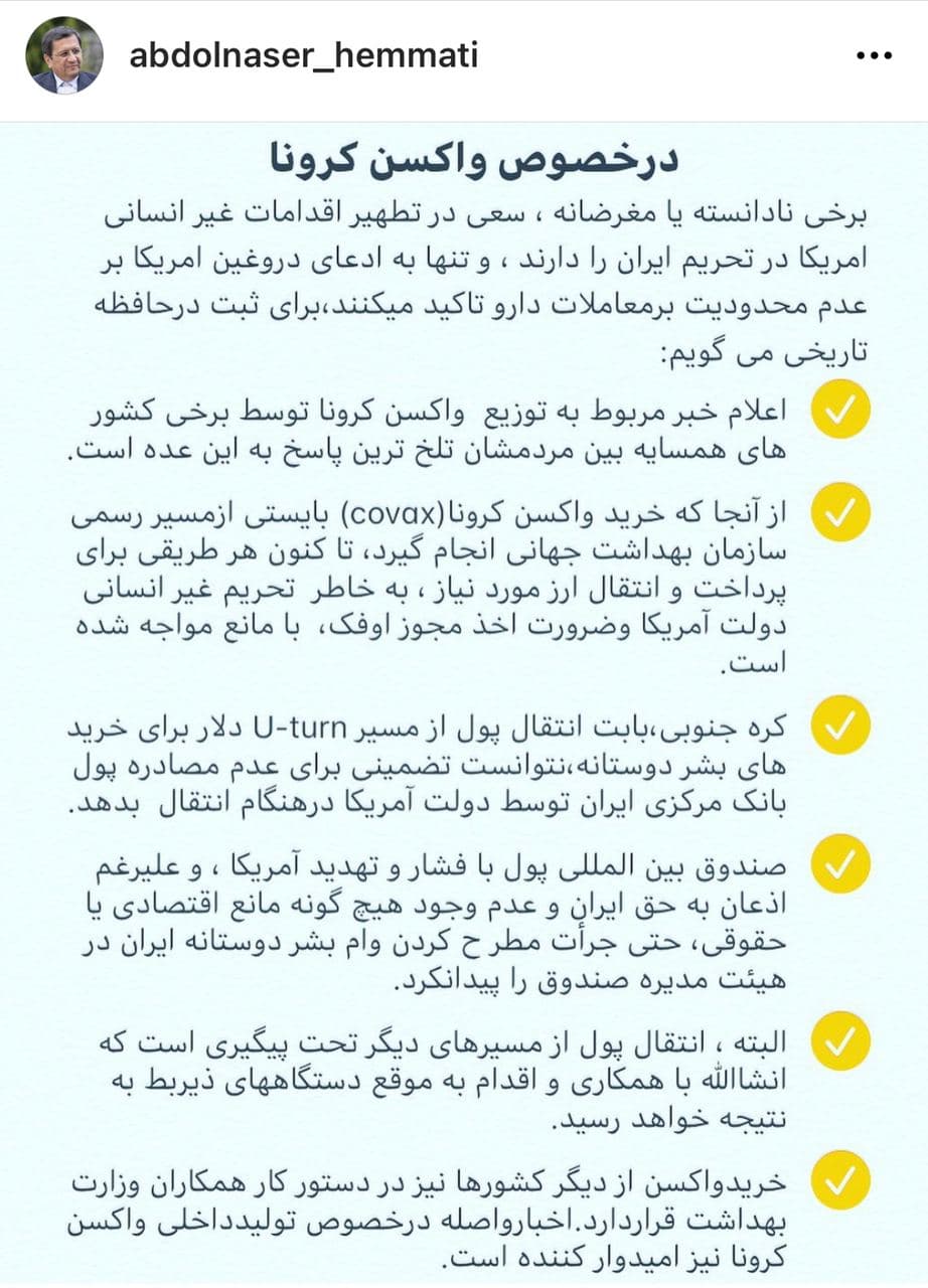 یادداشت رییس کل بانک مرکزی درباره واکسن کرونا