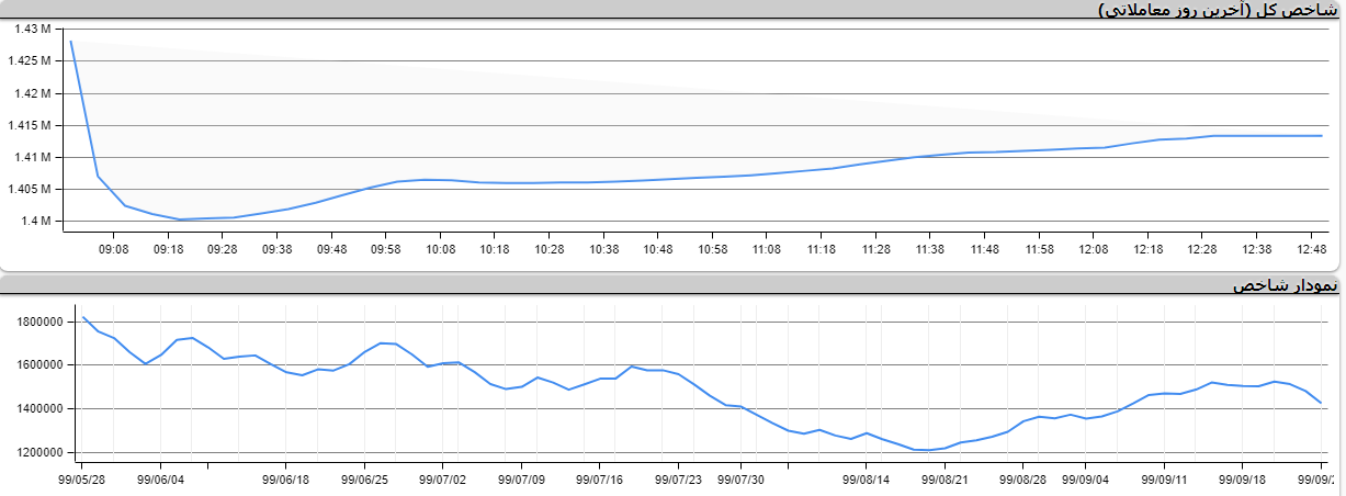 شاخص کل بورس اوراق بهادار با کاهش ۱۴۸۷۰ واحدی معادل ۱.۰۴ درصد به یک میلیون و ۴۱۳ هزار و ۴۵۴ واحد رسید. همچنین در فرابورس شاخص کل با افت ۳۲  واحدی به ۱۸ هزار و ۹۱۳ واحد رسید.
