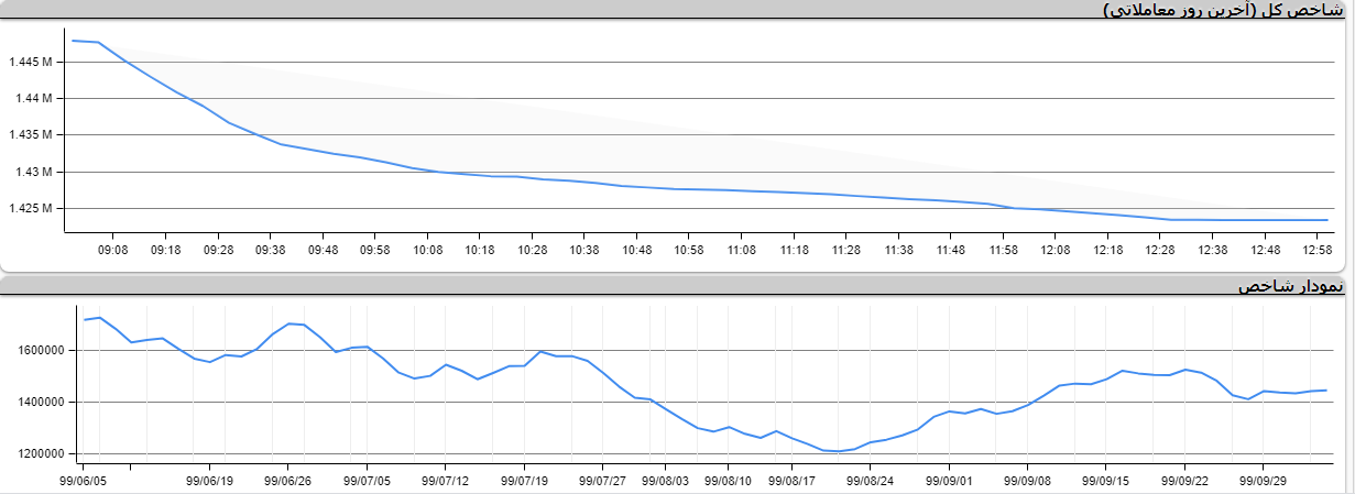 شاخص کل بورس اوراق بهادار با کاهش ۲۴۳۳۳ واحدی معادل ۱.۶۸ درصد به یک میلیون و ۴۲۳ هزار و ۵۸۱ واحد رسید. همچنین در فرابورس شاخص کل با افت ۶۹ واحدی به ۲۰ هزار و ۷۳ واحد رسید.
