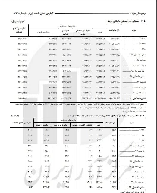اما در جدیدترین گزارش این بخش یعنی شش ماه سال جاری، کل مالیات ها به رقم ۸۵۲۲۳۹.۶ میلیارد ریال رسیده است که نسبت به دوره مشابه سال قبل، ۳۴.۱ درصد افزایش را نشان می دهد که این میزان درآمد مالیاتی دولت در نیم سال جاری شامل ۵۴۹۵۵۴.۵ میلیارد ریال مالیات های مستقیم و ۳۰۲۶۸۵.۱ میلیارد ریال مالیات بر کالا و خدمات می باشد که نسبت به دوره مشابه سال قبل، به ترتیب ۵۵ و ۷.۷ درصد رشد دارد.