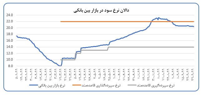 مدیریت نقدینگی در بازار بینبانکی به وسیله عملیات بازار باز (در قالب توافق بازخرید و خرید قطعی اوراق) و همچنین استفاده بانکها از اعتبارگیری قاعدهمند باعث بازگشت نرخ سود به دالان سیاستی شد. روند نزولی نرخ که از اوایل آبان ماه شروع شده بود، در ابتدای آذر ماه نیز ادامه داشت و در روزهای پایانی این ماه نرخ بازار در محدود ۲۰ درصد تثبیت شد. امید است با افزایش سهم اوراق بدهی دولتی در ترازنامه بانکهای دارای کمبود نقدینگی و گسترش استفاده از ابزارهای عملیات بازار باز، انضباط بیشتری در رابطه شبکه بانکی با بانک مرکزی حاکم شود.