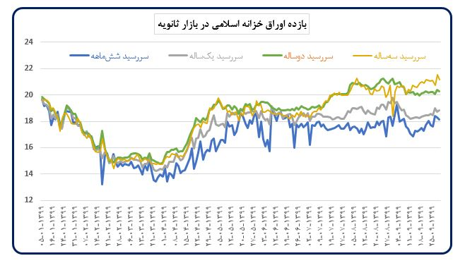 نرخ بازده اسناد خزانه اسلامی با سررسیدهای یک و دو ساله در آذر ماه نسبت به ماه قبل کاهشی بود و به ترتیب از ۱۸.۹۵ و ۲۰.۸۳ درصد در آبانماه به ۱۸.۶۷ و ۲۰.۳۶ درصد در آذرماه کاهش یافت. به دنبال تثبیت نرخ سود بازار بین بانکی، نرخ بازدهی اسناد خزانه نیز در آذر ماه نوسان کمتری را تجربه نمود که حاکی از تعدیل انتظارات تورمی است.