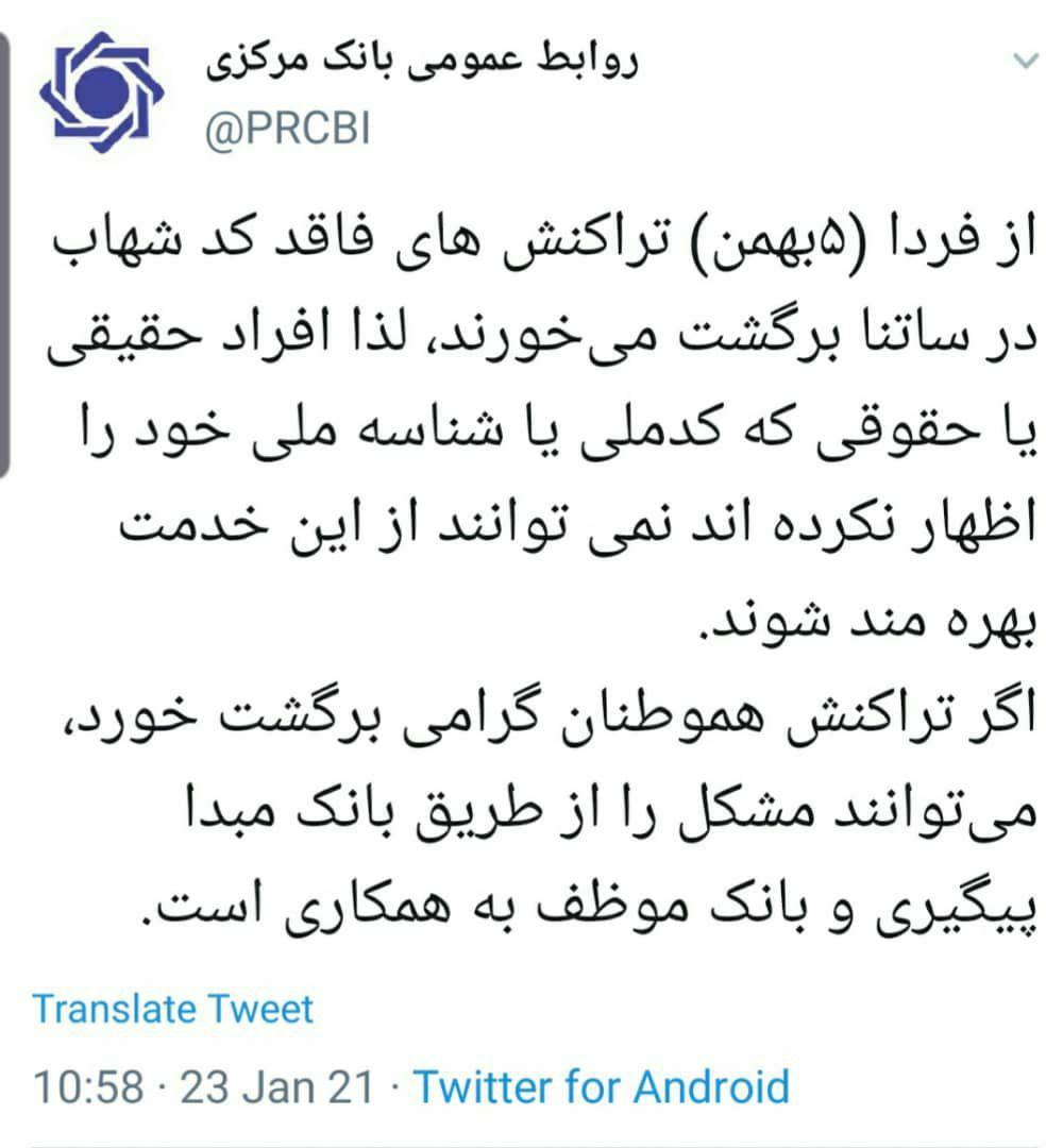 به گزارش ایبِنا، روابط عمومی بانک مرکزی روز گذشته در پیامی توییتری نوشت: از امروز (۵ بهمن) تراکنش‌های فاقد کد شهاب در ساتنا برگشت می‌خورند، لذا افراد حقیقی یا حقوقی که کدملی یا شناسه ملی خود را اظهار نکرده‌اند، نمی‌توانند از این خدمت بهره‌مند شوند.