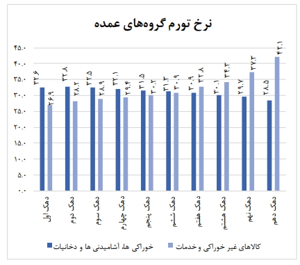 همچنین محدوده تغییرات تورم دوازده ماهه در گروه عمده «خوراکی ها، آشامیدنی ها و دخانیات» بین ۲۸.۵ درصد برای دهک دهم تا ۳۲.۸ درصد برای دهک دوم است. همچنین اطلاع مذکور در مورد گروه عمده «کالاهای غیر خوراکی و خدمات» بین ۲۶.۹ درصد برای دهک اول تا ۴۲.۱ درصد برای دهک دهم است