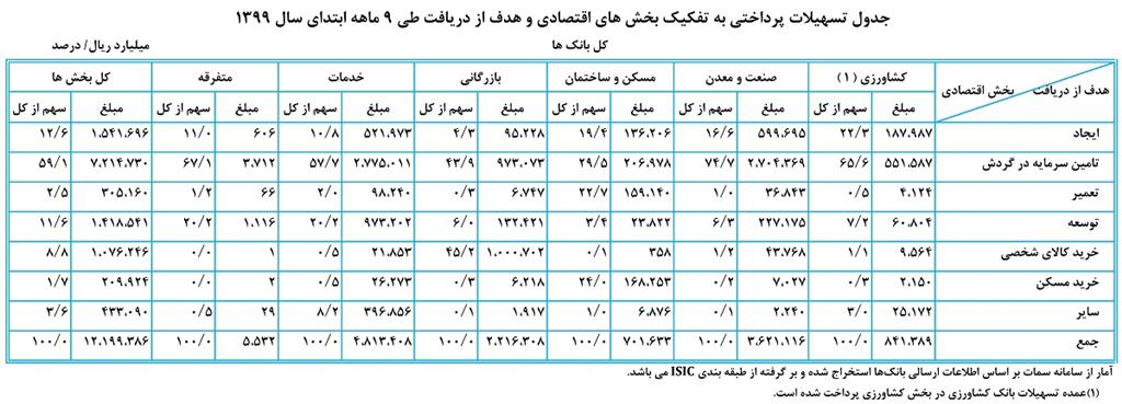 به گزارش ایبِنا به نقل از روابط عمومی بانک مرکزی، جدول ۱ بیانگر هدف از دریافت تسهیلات پرداختی در بخش‌های اقتصادی طی ۹ ماهه ابتدای سال ۱۳۹۹ است. سهم تسهیلات پرداختی در قالب سرمایه در گردش در تمامی بخش‌های اقتصادی طی ۹ ماهه سال جاری مبلغ ۷۲۱۴.۷ هزار میلیارد ریال معادل ۵۹.۱ درصد کل تسهیلات پرداختی است که در مقایسه با دوره مشابه سال قبل مبلغ ۳۸۰۶.۴ هزار میلیارد ریال معادل ۱۱۱.۷ درصد افزایش داشته است.