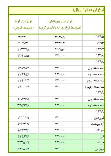 اما در سه ماهه دوم سال ۱۳۹۹، در حالی که نرخ دلار بازار بین بانکی (متوسط نرخ روزانه بانک مرکزی) بدون تغییر، ۴۲۰۰۰ ریال بوده است، در بازار آزاد نرخ متوسط فروش دلار به رقم ۲۲۵۹۷۸ ریال رسید که به طور مشخص تر، نرخ متوسط فروش دلار بازار آزاد، در تیرماه امسال ۲۱۲۶۷۶ ریال، در مردادماه سال جاری ۲۲۳۵۰۹ ریال و شهریورماه نیز ۲۴۲۸۱۴ ریال به ثبت رسیده است.