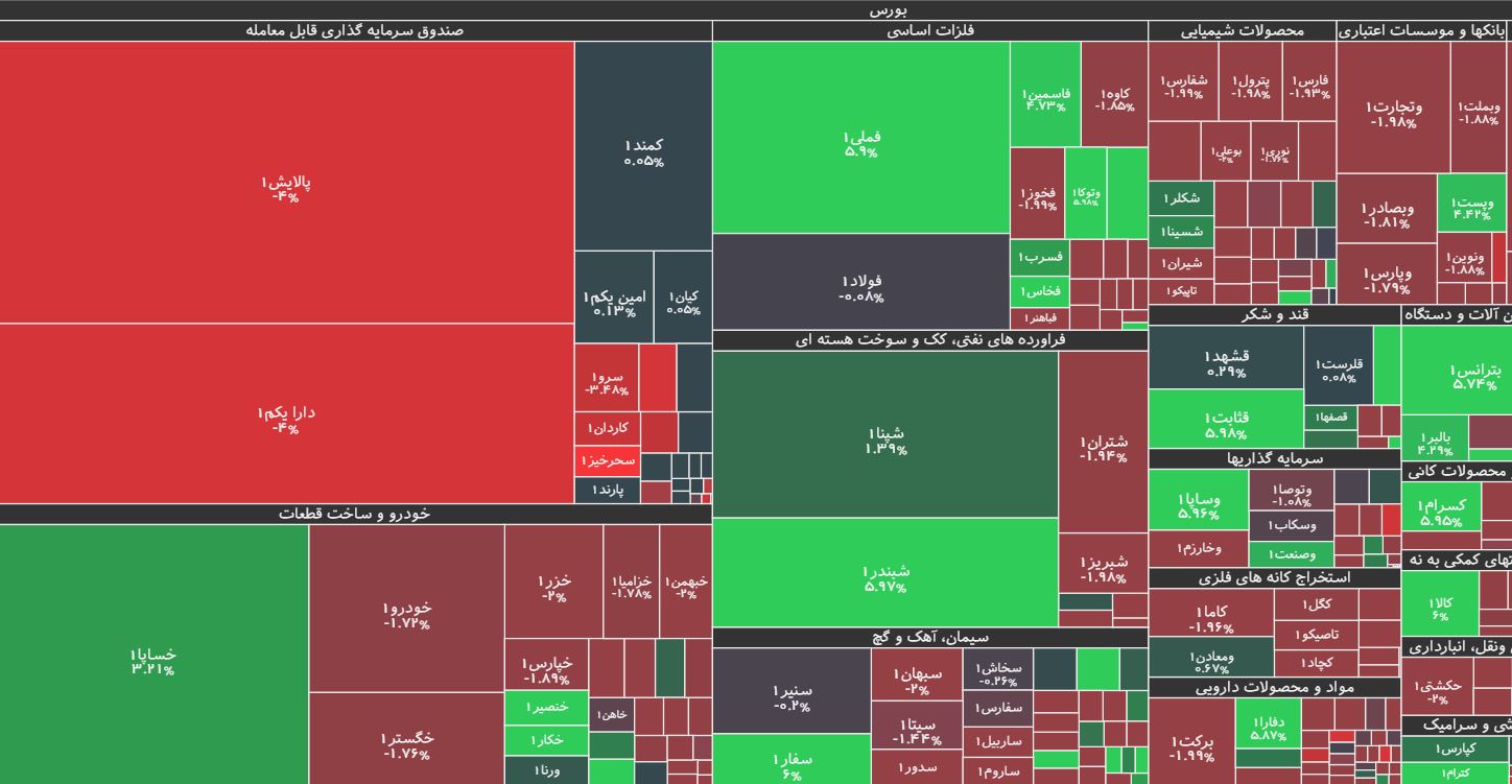 در بازار امروز، بیشترین افزایش قیمت متعلق به نماد فخاس (فولاد خراسان) با ۵.۹۸ درصد رشد و پس از آن، نمادهای سیلام، خچرخش، ولیز، شبندر و غشان بود. همچنین نماد معاملاتی سصفها(سیمان‌اصفهان) با ۲ درصد، بیشترین کاهش قیمت را داشت و پس از آن نیز، نمادهای ثفارس، شکربن، شپدیس، امین، فلوله و فنورد قرار گرفتند.