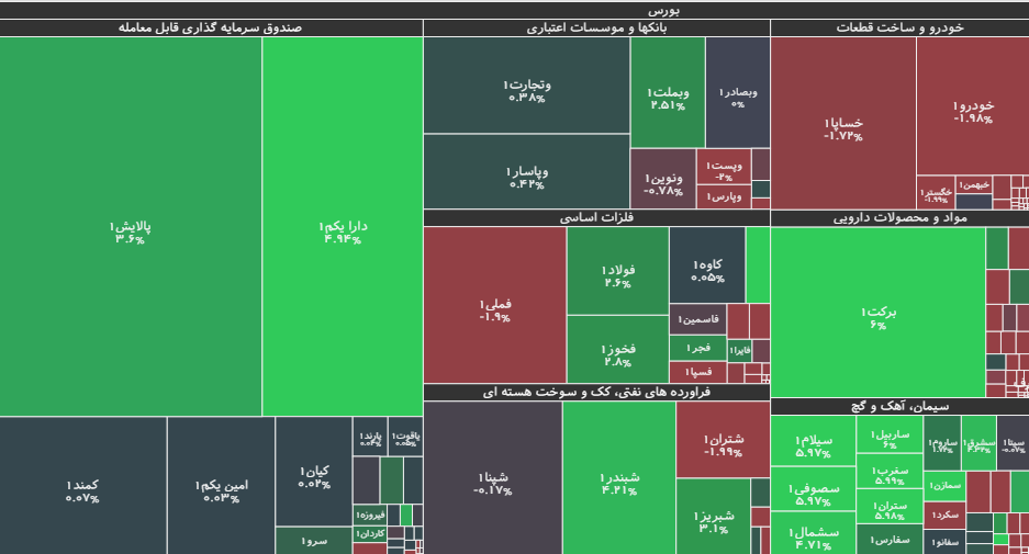 در بازار امروز، بیشترین افزایش قیمت متعلق به نماد فولاژ(فولاد آلیاژی ایران) با ۵.۷ درصد رشد و پس از آن، نمادهای سصوفی، سغرب، ستران، ساربیل و پاکشو بود. همچنین نماد معاملاتی کسرام(پارس سرام) با ۱۴.۳۶ درصد، بیشترین کاهش قیمت را داشت و پس از آن نیز، نمادهای خگستر، پارسیان، وپست، شیران، های وب و البرز قرار گرفتند.