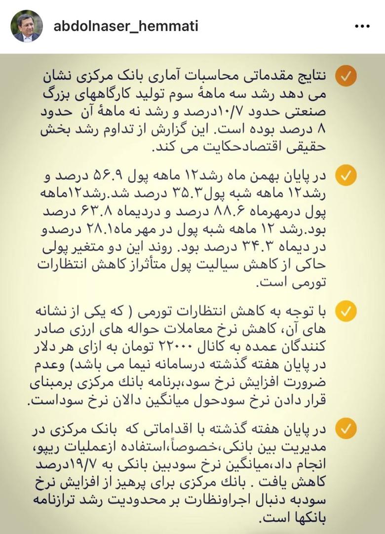 به گزارش ایبِنا عبدالناصر همتی رئیس کل بانک مرکزی در یادداشت اینستاگرامی در صفحه شخصی خود نوشت: نتایج مقدماتی محاسبات آماری بانک مرکزی نشان می دهد رشد سه ماههٔ سوم تولید کارگاههای بزرگ صنعتی حدود ۱۰/۷درصد و رشد نه ماههٔ آن  حدود  ۸ درصد بوده است. این گزارش از تداوم رشد بخش حقیقی اقتصاد حکایت می کند.