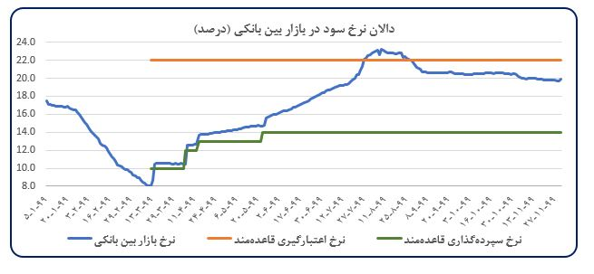 ه) با توجه به کاهش انتظارات تورمی، ضرورتی مبنی بر تغییر نرخ سود بازار بینبانکی تشخیص داده نشده و بانک مرکزی سیاست پولی را بهگونهای اعمال کرده است که نرخ سود بازار به سمت نرخ سیاستی هدایت شود.