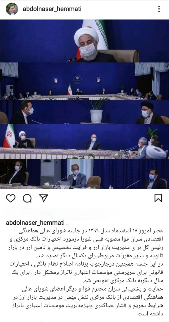 به گزارش ایبِنا در این یادداشت اینستاگرامی آمده است: عصر امروز ۱۸ اسفندماه سال ۱۳۹۶ در جلسه شورای عالی هماهنگی اقتصادی سران قوا مصوبه قبلی شورا در مورد اختیارات بانک مرکزی و رئیس کل برای مدیریت بازار ارز و فرایند تخصیص و تأمین ارز در بازار ثانویه و سایر مقررات مربوط، برای یکسال دیگر تمدید شد. در این جلسه همچنین در چارچوب برنامه اصلاح نظام بانکی، اختیارات قانونی برای سرپرستی مؤسسات اعتباری ناتراز و مشکل دار، برای یک سال دیگر به بانک مرکزی تفویض شد.