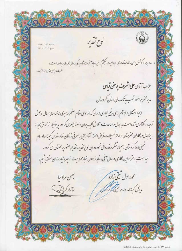 در پایان جلسه مدیرکل کمیته امداد امام خمینی (ره) کردستان با اهدای لوح از خدمات بانک ملی استان در زمینه اعطای تسهیلات اشتغال به مددجویان تحت حمایت این نهاد قدردانی کرد. شیخی زاده همچنین از تعدادی از شعب موثر در این بخش با اهدای لوح تقدیر کرد.