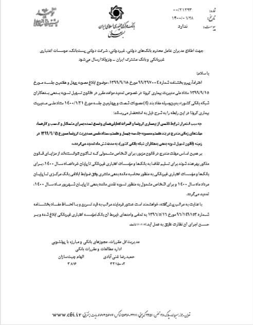 به سبب استمرار شرایط ناشی از بیماری کرونا و اثرات تعطیلی های وضع شده برای مشاغل و کسب و کارها، مهلت های زمانی مندرج در بند هفتم مصوبه جلسه چهل و هفتم ستاد ملی مدیریت کرونا مورخ ۱۳۹۹/۰۹/۱۵ در زمینه (قانون تسهیل تسویه بدهی بدهکاران شبکه بانکی کشور) به مدت ۶ ماه تمدید می گردد.