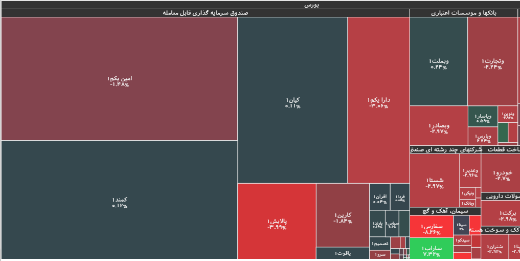 در بازار امروز، بیشترین افزایش قیمت متعلق به نماد شغدیر(پتروشیمی غدیر) با ۶ درصد رشد و پس از آن، نمادهای ساراب، وکار، وپاسار، وبملت و شفن بود. همچنین نماد معاملاتی سفارس(سیمان فارس و خوزستان) با ۷.۶۶ درصد، بیشترین کاهش قیمت را داشت و پس از آن نیز، نمادهای رتاپ، سغرب، سشرق، وساخت، وساپا و شپنا قرار گرفتند.