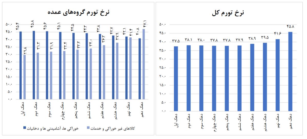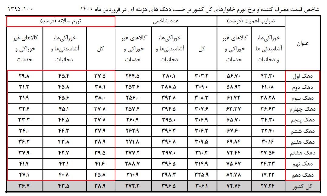 بر اساس این گزارش، در فروردین ماه ۱۴۰۰، نرخ تورم سالانه کالاهای غیر خوراکی و خدمات ۳۶.۷ درصد در کل کشور اعلام شده است. به گونه ای که کمترین نرخ تورم سالانه کالاهای غیرخوراکی برای دهک اول با ۲۹.۸ درصد و بیشترین نرخ تورم نیز برای دهک دهم ۴۷.۱ درصد برآورد شده است.