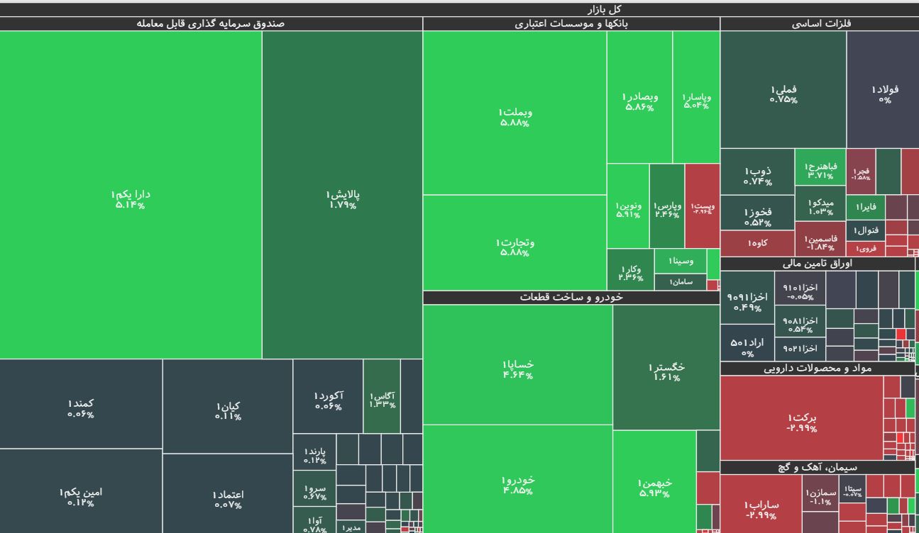 در بازار امروز، بیشترین افزایش قیمت متعلق به نماد خبهمن(گروهبهمن) با ۵.۹۳ درصد رشد و پس از آن، نمادهای کنور، وبملت، وبصادر، وتجارت و ونوین بود. همچنین نماد معاملاتی اخابر(مخابرات ایران) با ۲.۹۷ درصد، بیشترین کاهش قیمت را داشت و پس از آن نیز، نمادهای وتوس، خزامیا، وپست، رمپنا، حکشتی و زپارس قرار گرفتند.