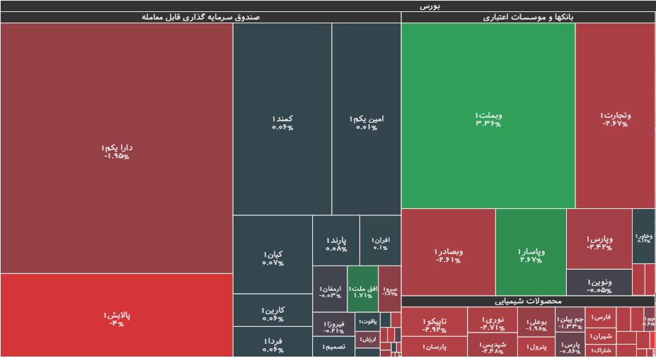 در بازار امروز، بیشترین افزایش قیمت متعلق به نماد وساخت(سرمایه گذاری ساختمانایران) با ۴.۴۳ درصد رشد و پس از آن، نمادهای ثمسکن، وپخش، وبملت، وپاسار و واعتبار بود. همچنین نماد معاملاتی شستا(سرمایه گذاری تامین اجتماعی) با ۳ درصد، بیشترین کاهش قیمت را داشت و پس از آن نیز، نمادهای قنیشا، پارسان، ساراب، برکت، شپدیس و فایرا قرار گرفتند.