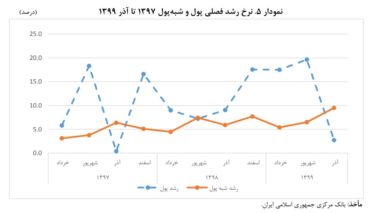 این احتمال از آبان ماه قوت گرفت، به طوری که در ماه های آبان و آذر رشد پول متوقف شد و نقدینگی تنها از محل شبه پول رشد کرد. طی این دو ماه نقدینگی ۵.۴ درصد و شبه پول ۷.۴ درصد رشد کردند.