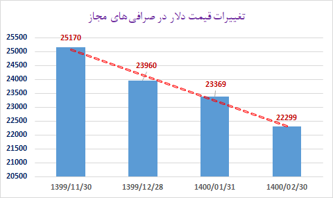 بر این اساس نرخ فروش هر اسکناس دلار آمریکا در پایان فروردین ماه سال جاری، ۲۳۳۶۹ تومان ارزش گذاری شد. تداوم کاهش پلکانی دلار در هفته های گذشته، سرانجام به افت بهای دلار آمریکا به کانال بیست و دو هزار تومانی منجر شد و نرخ فروش دلار آمریکا در آخرین روز اردیبهشت ماه امسال، به رقم ۲۲۲۹۹ تومان کاهش یافت.